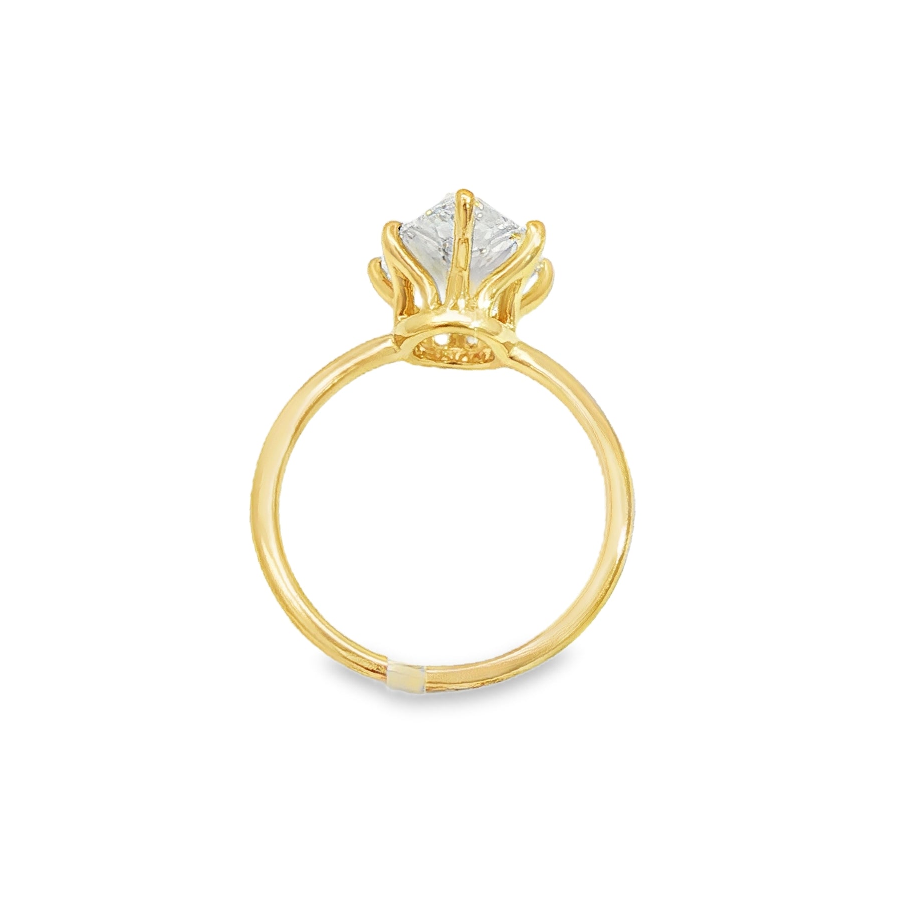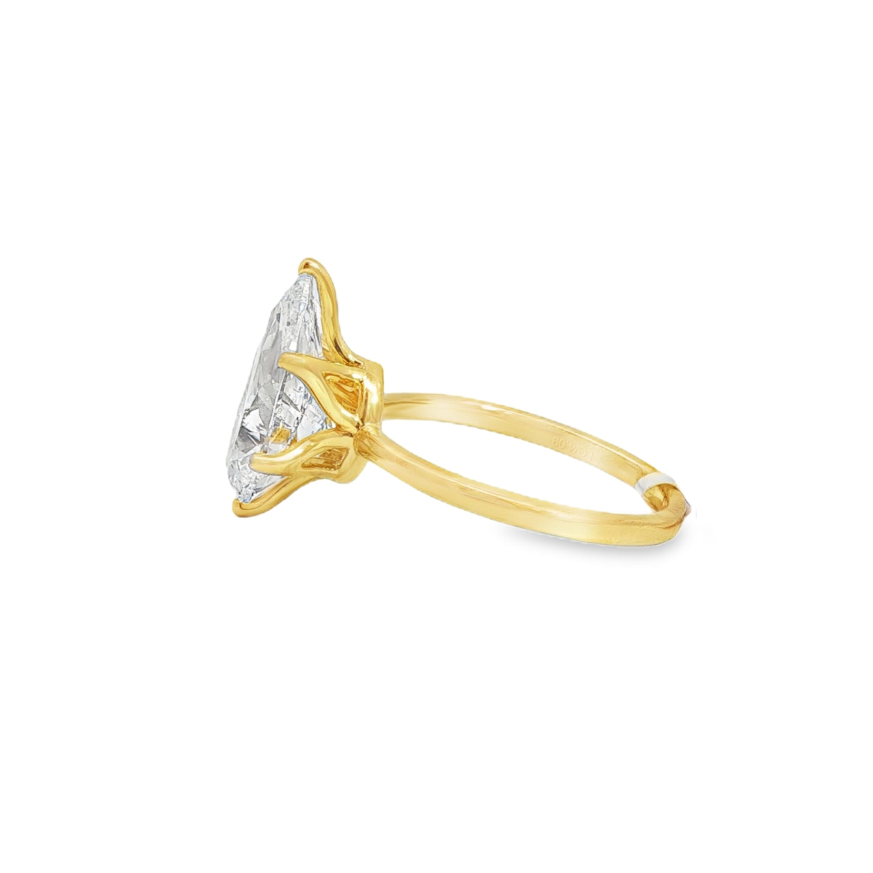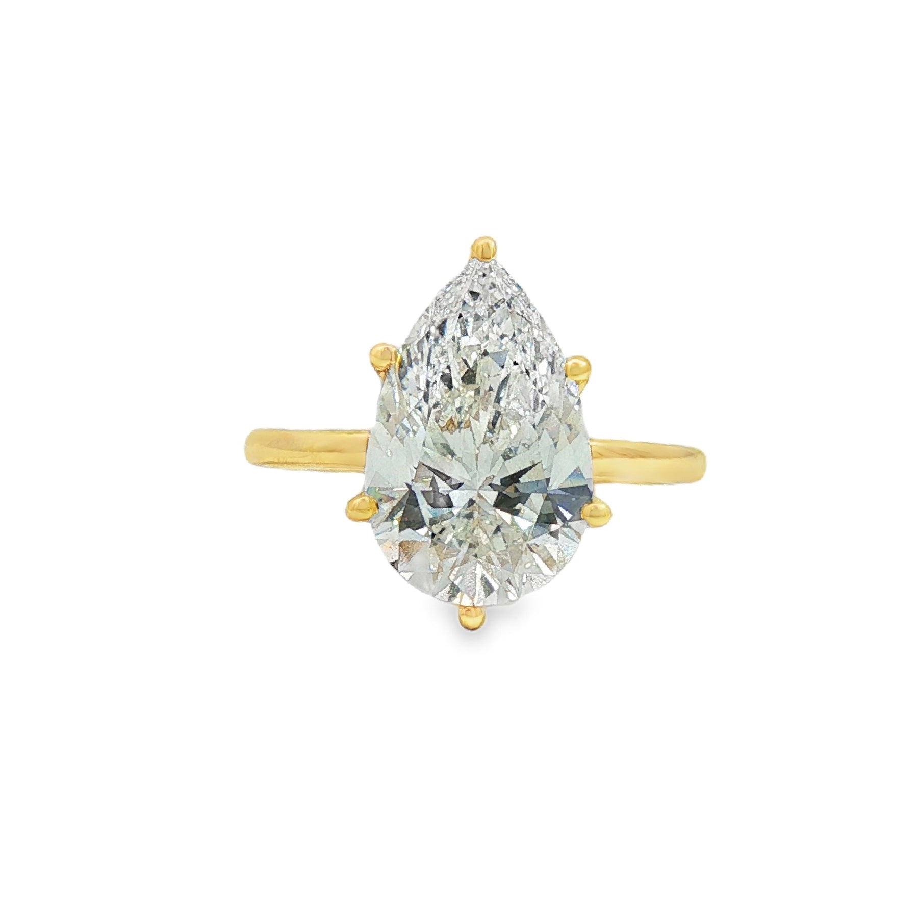 14K yellow gold engagement ring with one pear-shaped lab-grown diamond weighing 4.09 carats. The ring features a plain, solid band with a polished finish.