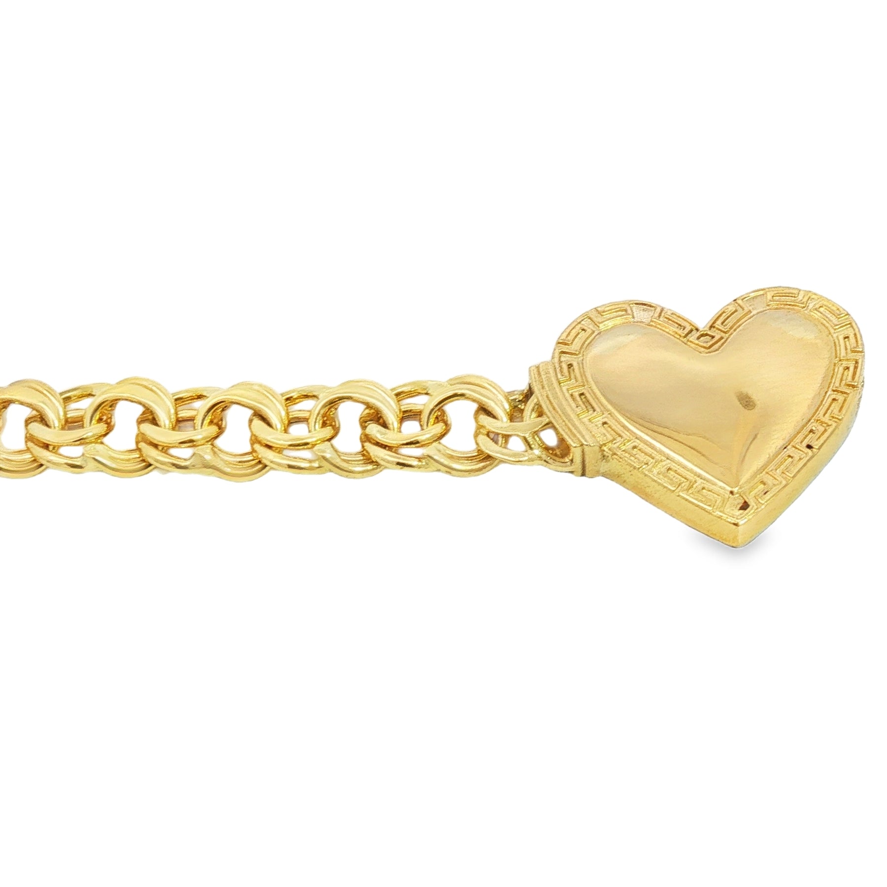 Hollow Chino Link Heart Bracelet, crafted in solid 10K gold. Featuring a bold and elegant heart-shaped centerpiece, the design is accented with a classic Greek key border, symbolizing infinity and unity. The sturdy Chino link chain adds weight and luxury, while the heart plate offers a free engraving option, perfect for personalizing with a name, date, or meaningful message.