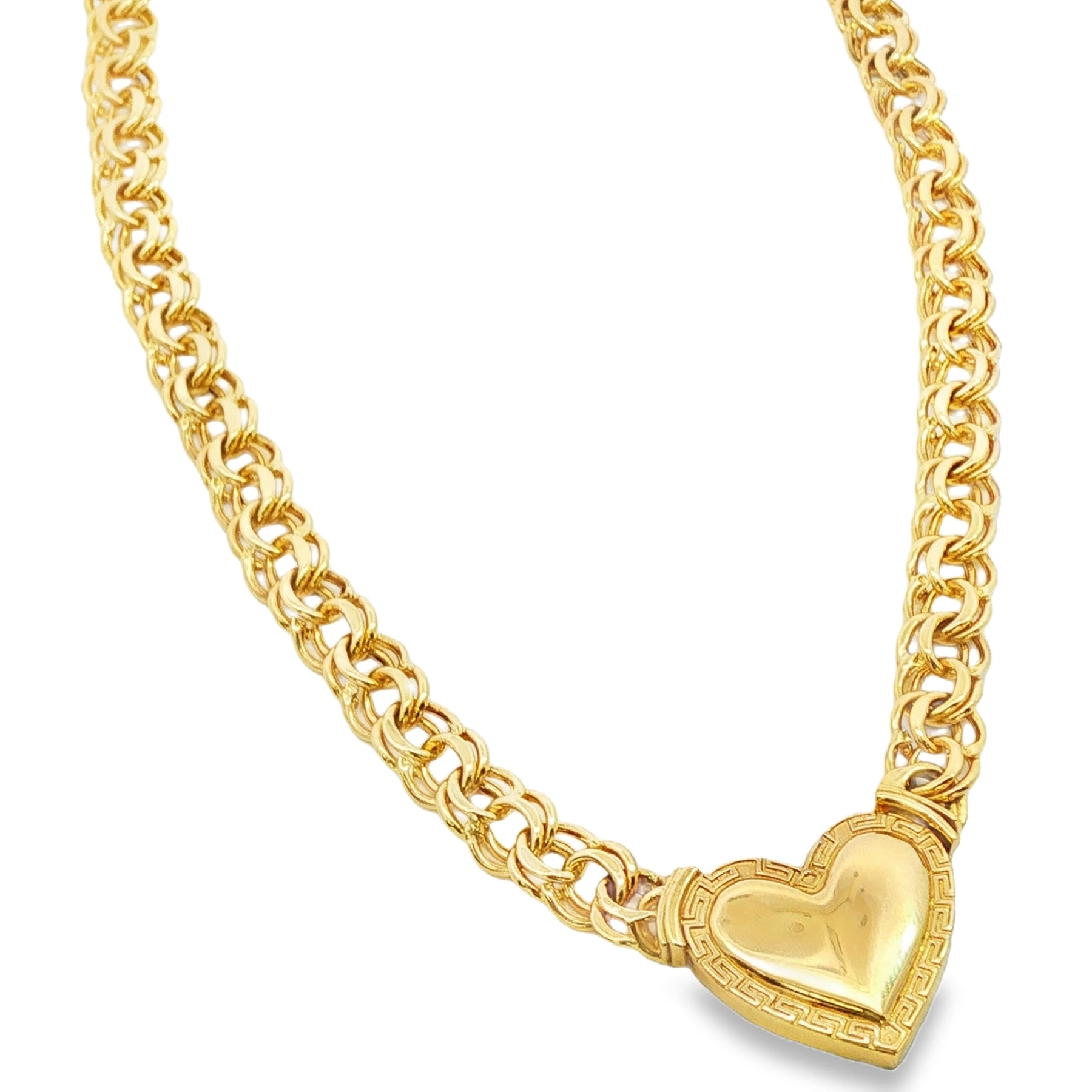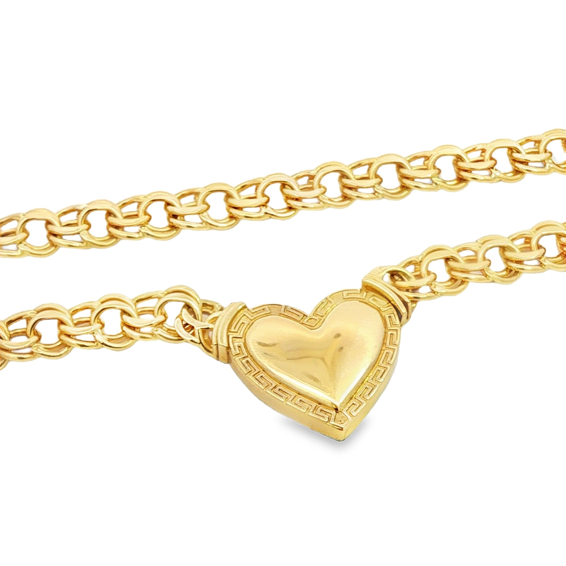 Regular price $1,789.99This elegant 10K yellow gold necklacefeatures classic Chino links and a hollow design for lightweight comfort. At its center is a polished heart charm, bordered with a timeless Greek key pattern. The heart is engravable—perfect for adding a personalized touch such as an initial, date, or name, making it a meaningful gift or keepsake.